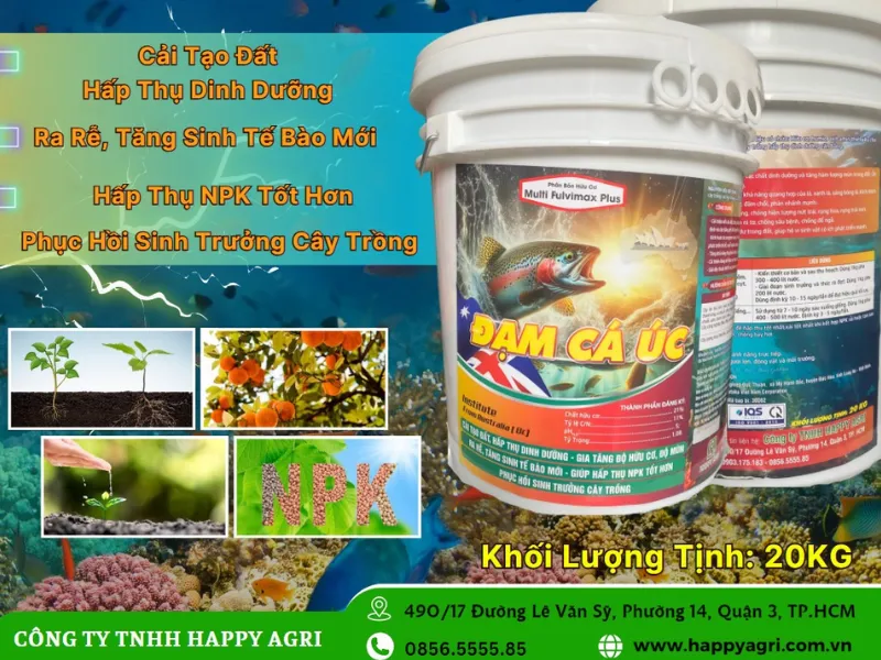 Việc nâng cao năng suất và chất lượng cây trồng chưa bao giờ dễ dàng hơn với Đạm Cá Úc Multi Fulvimax Plus. Sản phẩm không chỉ thúc đẩy sự sinh trưởng mạnh mẽ mà còn bảo vệ cây trồng khỏi những tác động bất lợi từ môi trường. Hãy để Đạm Cá Úc Multi Fulvimax Plus đồng hành cùng bạn trong mỗi vụ mùa, mang lại những kết quả vượt trội và bội thu. Liên hệ ngay với Happy Agri để nhận được sự tư vấn chuyên nghiệp và sở hữu sản phẩm chất lượng, giúp bạn tối ưu hóa hiệu quả canh tác và phát triển nông nghiệp bền vững.